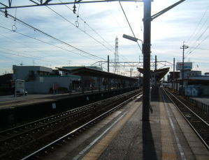 木曽川を渡ると、愛知県に入ります。 そして、こちらの画像のように、複々線のような感じに見えますが、左2つの線路は、JR東海道線です。木曽川から一宮間は並行して走ります。 運が良いと、JR東海車両VS名鉄車両のスピードレースが展開されます。 |