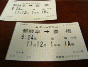 わたくしらが乗るのは、9時24分発の特急豊橋行き。 これが指定席券です。名鉄では、指定席券と呼ぶのではなく、「ミューチケット」と呼んでおります。 この切符から分かるかと思いますが、一番前の席です。 |