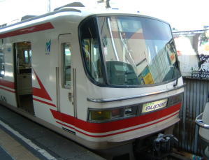 そう、こちらの車両に始発駅から乗りたいわけで…。 この車両は、名鉄の特急電車で「パノラマスーパー」(6両編成)です。 これで、一気に豊橋まで行きます。 運転台が下にあり、二階建て構造となっております。これは前の部分です。前の2両は指定席車です。 この二階になっている所は、自称展望席と言われております。 |