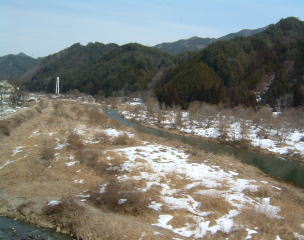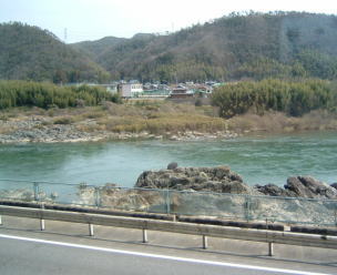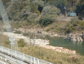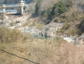 鵜沼駅を過ぎると、木曽川に接近し、ちょっとした山岳ムードとなります。ここは、ライン下りで有名なところです。 自称ドイツのライン川に似ているところから名前が付けられたそうです。 船下りしている、船はあいにく見えませんでした。 |