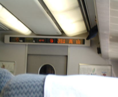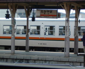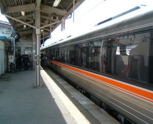 側面を撮った写真ですが、行き先名が見にくいですね。じつは、富山行きです。これで、北陸の富山まで行くと、3時間半以上かかります。高山までは、2時間少々の所要時間です。 北陸の富山まで「しらさぎ」で、というのがありますが、実を言うと、「ひだ」で行くほうが値段は安いのです。 そんなこんなで、ウロウロしていると発車時間が近づきました。 |
