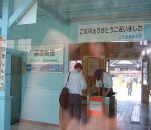 12時45分、播磨新宮(はりましんぐう)駅に着きました。 姫新線で、ここは、大きな駅です。 これを見るとローカルの駅だ…と感じてしまいますよね。 車内は、1両だからなのか、混雑したままでした。 |