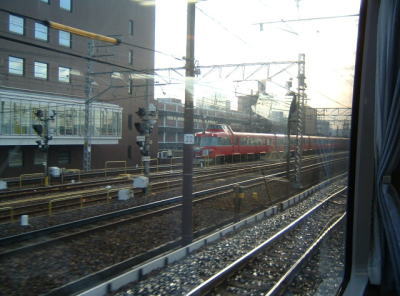 定刻どおり、名古屋駅を発車しました。 しばらくすると、名鉄のパノラマカーが見えてきました。 |
