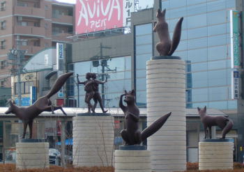 豊川駅に戻ってきました。 ロータリーには、このように、きつねばかりの像がありました。 豊川はきつねの市なのでしょうか? |