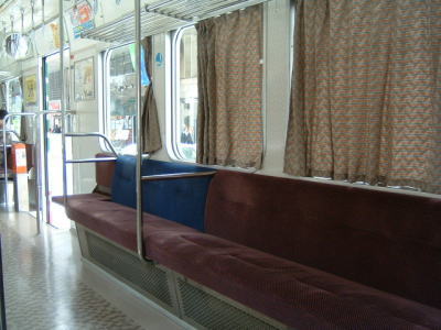 車内は、ロングシート。 でも、車幅が狭いので、車内が狭く感じるのも難点ですね。 |