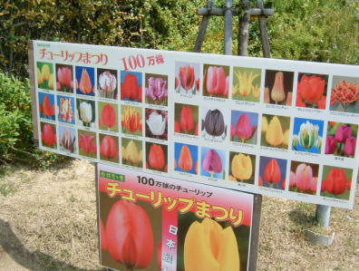 「花ひろば」のメインもチューリップです。 この看板を見ればお分かりになるかと思いますが、すごい種類があるんですね。 では、早速入ることにします。 |