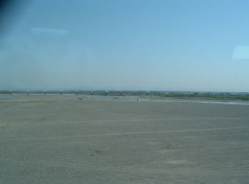 浜松を出ると、しばらくして天竜川を渡ります。 川幅は長いのですが、新幹線のスピードですと、あっという間の感じで鉄橋を渡っていきます。 |