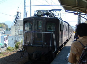 元近鉄車が発車して、しばらくすると、電気機関車を先頭にして、SL急行が到着しました。