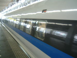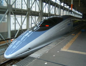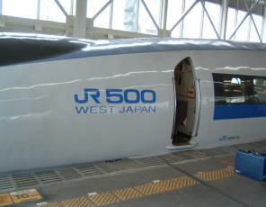 こちらが、乗る新幹線です。 500系新幹線です。 独自な形をしており、異彩を放っております。 この新幹線は、最高速300kmを出す、日本で一番速い新幹線です。 |