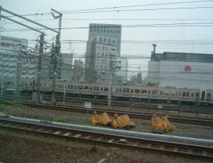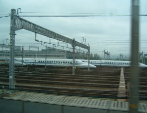 新大阪の手前では、新幹線の車両基地がありました。 700系、300系などJR東海の新幹線がズラリ…と並んでました。 |