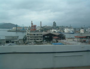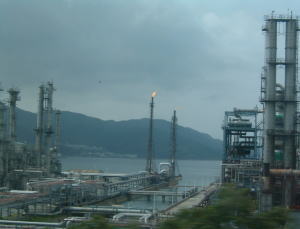 広島駅を過ぎて、しばらく走行すると、徳山駅を通過します。 このあたりは、工場群があり、この画像のように、オレンジ色の炎が見え、良い車窓風景となっております。 |