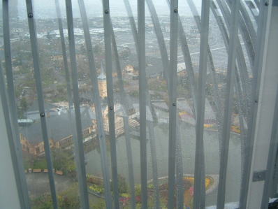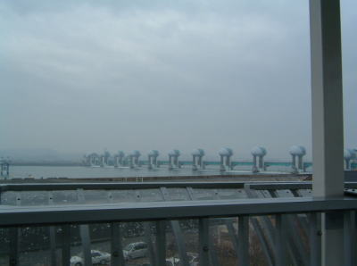 ブザーが鳴って上昇をはじめました。 近くに、長良川河口堰が見えました。 実を言うと、わたくし、大の高所恐怖症なんです・・・ |