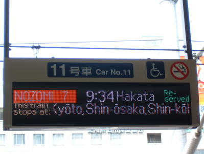 車椅子のM.S君と共に、JR名古屋駅に到着しました。 まず、初めに乗るのは、こちらの9時34分発の「のぞみ7号」博多行きです。 ここでは、車椅子席をキープしました。 |