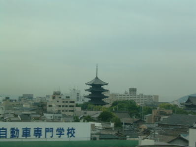 約40分経った、10時11分、京都(きょうと)駅につきました。 この五重塔が目印ですよね。 車窓は、進行方向左側に見えます。 |