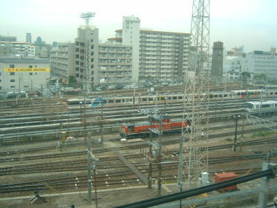 新大阪駅を出て、しばらくすると、JRの車両基地が見えるようになります。 JR西日本の一般型車両が上から覗けます。 |