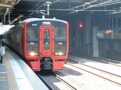 そして、わたくしたちはこちらの列車に乗ることにしました。 813系の門司港行きです。 この813系、名古屋地区には無い車両ですから、M.S君は、車内でも驚いていました。 |