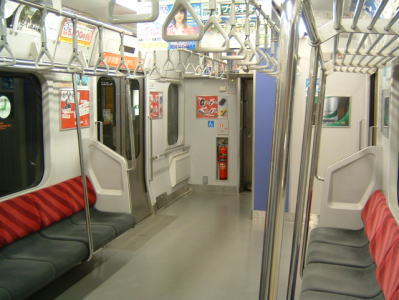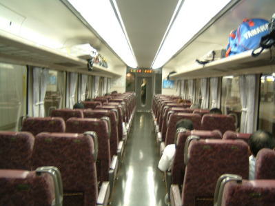 そして、車内は、このようにロングシート。 一部にはボックスシートもあるのですが、車椅子専用トイレがある車両がここにあったので、ロングシートに座るしかありません。 |