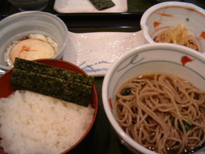 朝7時半になると、レストランが営業をはじめたので、早速入ることにしました。 わたくしらは、朝定食を注文。 このように、納豆、のり、たまご、ご飯と小さなそばがついたセットを食べました。 |