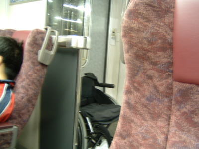そして、肝心の車椅子ですが、車椅子席が無かったので、このように扉付近に車椅子を置いて、JR九州馬鹿君を座席へ座らせました。