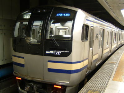ここからは、5時04分発、総武線の快速エアポート成田に乗車して、成田空港へ向かいます。 車両は、E217系です。 |