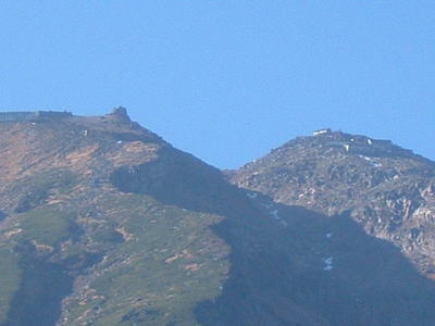そして、頂上付近も拡大して撮りました。 山頂に建物があるのが分かりますね。 神社の建物です。 |