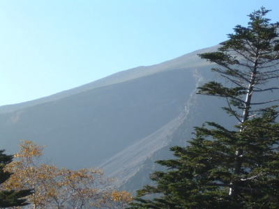 御嶽山の左側では、地すべりがあったのか、山が崩れていました。