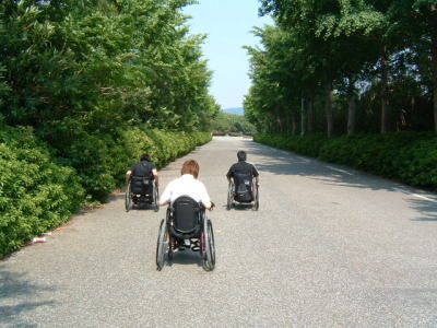 終点の運動公園駅で下車しました。 広い公園ですので、このように車椅子トリオも元気に走っていました。天気もよく、散歩日和でした。 運動公園内で、休憩を撮ったり、散歩したりして時間を潰しました。 |