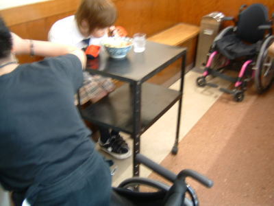 JR九州馬鹿は、車椅子に乗りながら、まひるさんは、車椅子を降りて、このように座りながら食べていました。