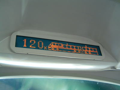 発車して、しばらくすると、時速120kmの表示が・・・。 このような電光表示があると、楽しいものです。 |