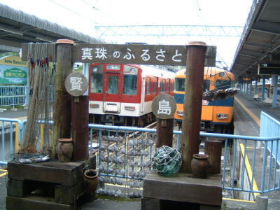 車止めには、真珠のふるさと・・・と書いてありました。 このあたりは真珠が有名な産地です。 賢島駅のホームは、5線もあり、大きな駅でした。 |