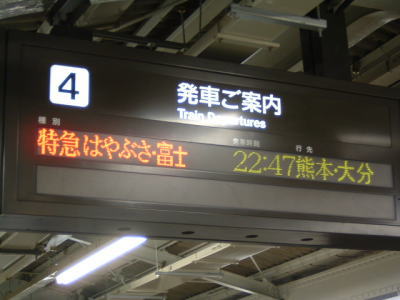 まずは、名古屋(なごや)駅から、スタートです。 ここで、おくちまんさんと出会いました。 発車案内には、わたくしの乗る、「はやぶさ・富士」の案内が出ておりました。 |