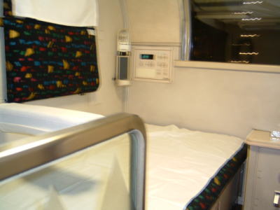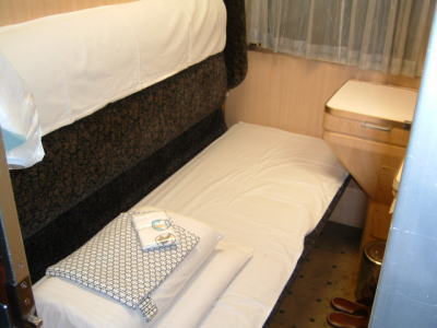 そして、こちらは、ベットにした状態。 座席の幅が全く変わってなく、おくちまんさんもわたくしも、このベッドの狭さには、驚きました。 B個室寝台ソロと同じ幅でした。 |