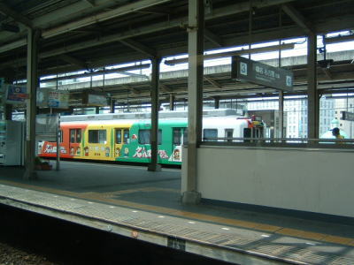 10時57分、四日市(よっかいち)駅に到着しました。 ここでは、降りる客も多く、また乗る客も多かったです。 |