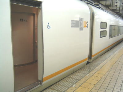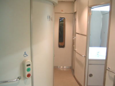 早速、車内へと入っていきます。 今回は、車椅子席を確保しました。 なので、車椅子用トイレ、洗面台などが楽に使えます。 |