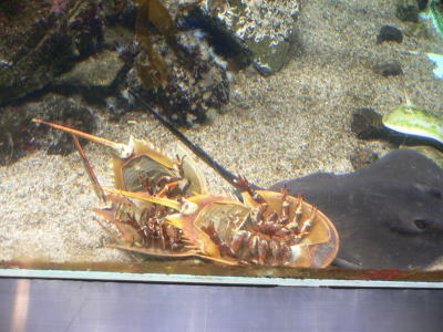 そして、こちらは、生きている化石といわれる、カブトガニです。 しかも、二匹とも裏を向いてしまい、表を向けずに苦しんでいるようでした。 |