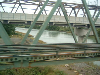 長野新幹線の高架橋も寄り添ってきて、犀(さい)川を渡ります。 この川が川中島の戦いが起きたところです。 |