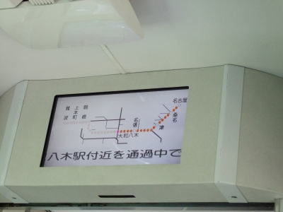 名古屋を出て、約40分ほどで津(つ)駅を通過します。 このように主要駅を通過するときは、モニターで案内が出ます。 |