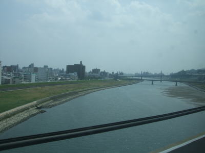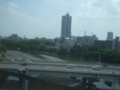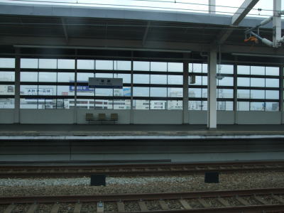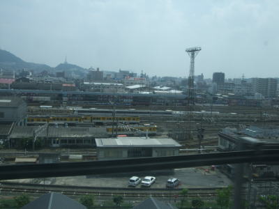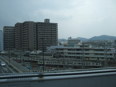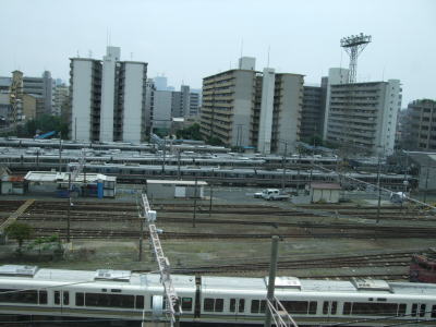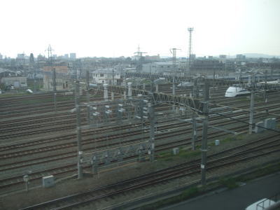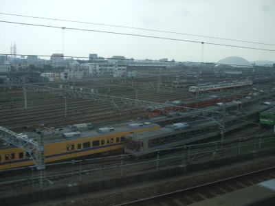 定刻に発車すると、まずは在来線の車両基地が見えました。 新大阪と比べ、車両がだいぶ異なります。 |