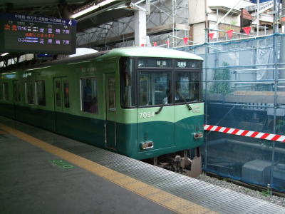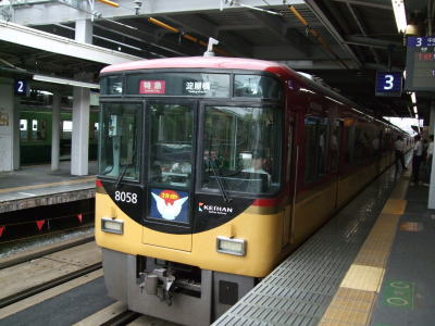 京阪電車のホームに来ました。 ちょうど、準急が到着しました。