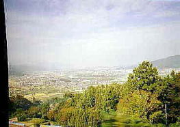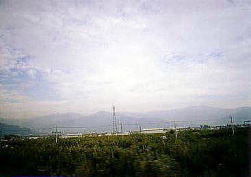 列車は、木曽福島を過ぎ、しばらくすると、山並みが消えていき、盆地が広がります。すると、塩尻駅につきます。塩尻は、東京方面への中央線と、長野方面への篠ノ井線と分岐する駅です。もちろん、このまま長野へ向かいます。 松本を過ぎて、快適に進んでいくと、ごらんのように、このような景色に出会います。これが、姨捨から見える、善光寺平です。天気が良いと最高の景色です。 |